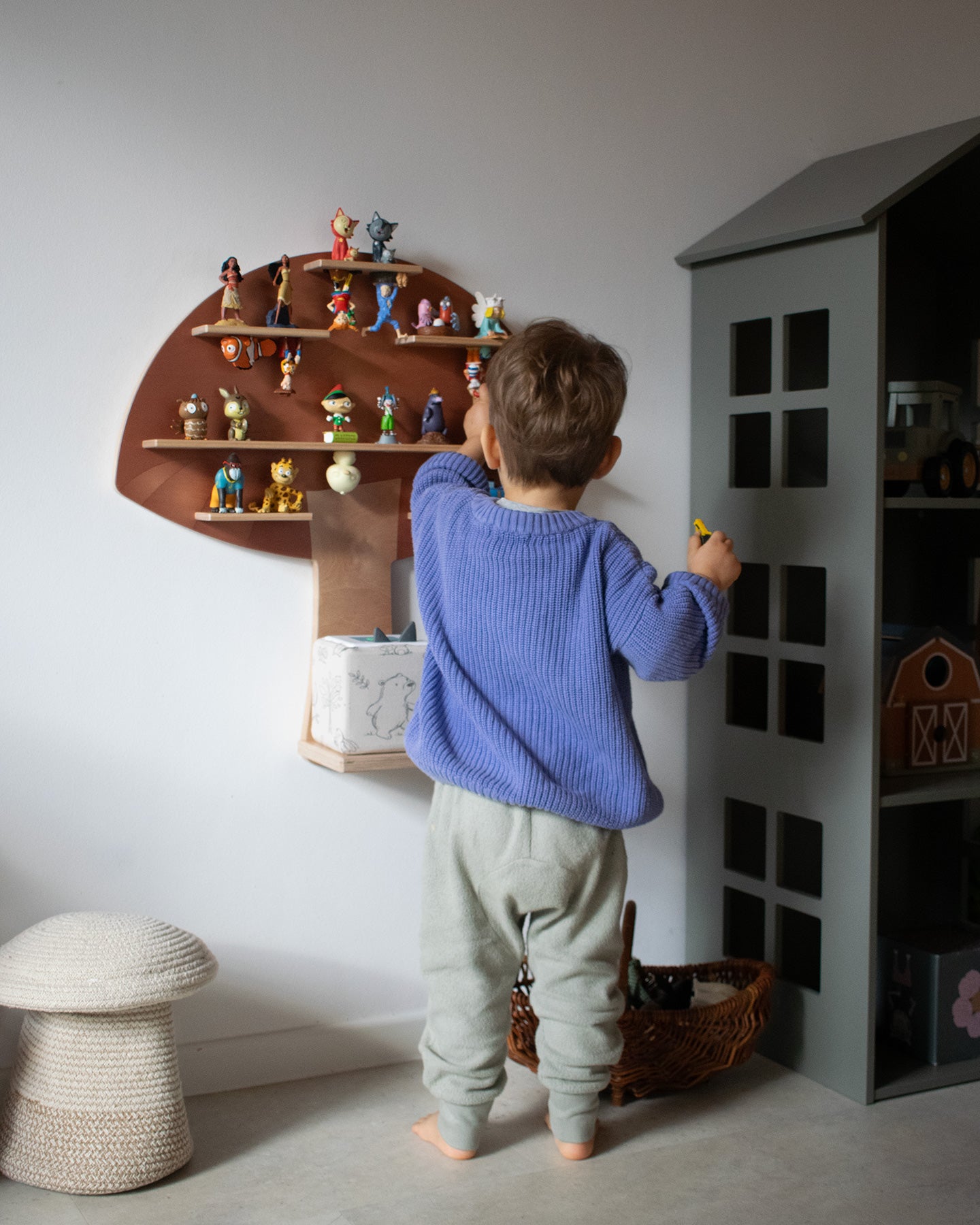 Die liebevoll gestalteten Regale bringen Ordnung und verwandeln das Kinderzimmer in eine kleine Fantasiewelt voller Wald-Charme. So macht Aufräumen gleich viel mehr Spaß und die Lieblingsgeschichten sind immer griffbereit.